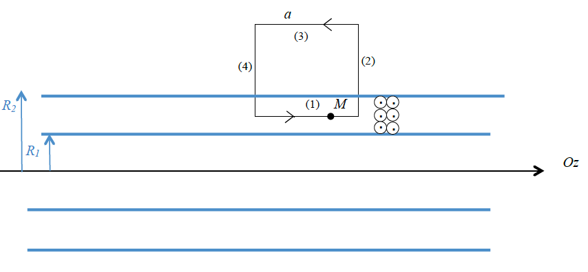 On utilise le théorème d’Ampère en choisissant un contour rectangulaire dont deux côtés sont parallèles à , de longueur selon l’axe , dont l’un des côtés parallèle à passe par M, et l’autre est extérieur au cylindre , l’autre côté qui lui est parallèle passant par . Ce contour est orienté pour que la normale soit selon le vecteur en .