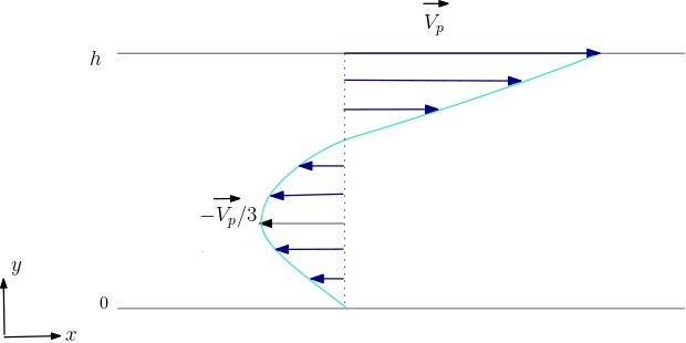 Une plaque, en y=0 est fixe, et l’autre, en y=h, est mobile de vitesse constante Vp=Vpux. On se place en régime stationnaire. L’écoulement est unidirectionnel. On néglige la pesanteur.
