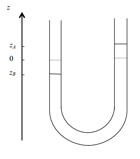 Au repos, la surface libre du liquide est à l’altitude commune z=0. À la suite d’une perturbation initiale, il apparait une dénivellation entre les deux branches du tube h(t)=zA(t)−zB(t). En faisant un bilan d’énergie mécanique, calculer la période T des oscillations du liquide dans le tube.