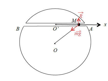 Un objet de masse m peut se déplacer sans frottement dans un tunnel rectiligne creusé à l’intérieur de la Terre et joignant deux points A et B appartenant à la surface terrestre. La Terre est supposée homogène et à symétrie sphérique, de masse totale MT, de rayon RT=6,4.106 m. Le champ de pesanteur, assimilé au champ de gravitation, a une intensité g0=9,8 m.s−2 à la surface terrestre.