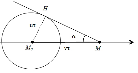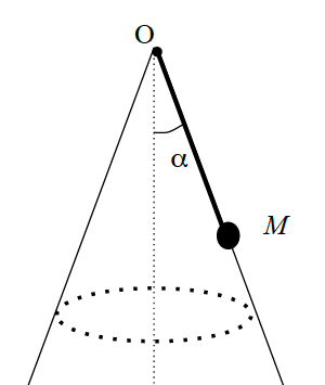 Soit un cône de sommet O, d’angle α. Un point matériel M de masse m est attaché au point O par un fil inextensible de masse négligeable et de longueur ℓ. Le fil ne frotte pas sur le cône, et le coefficient de frottement entre M et le cône est μ. On lance le point matériel avec une vitesse v0 perpendiculaire au plan contenant l’axe du cône et M. Le point décrit une trajectoire circulaire. Déterminer la date à laquelle M s’arrête.