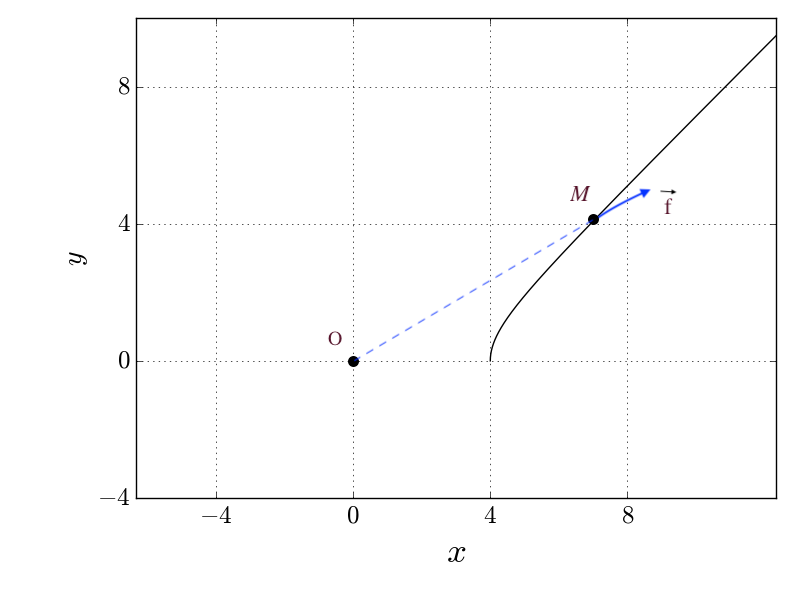 le mouvement est plan (M est dans le plan passant par O et perpendiculaire au vecteur constant LO=OM∧mv0). Le plan de la trajectoire est le plan (OM,v0).