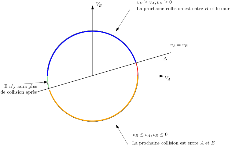 On obtient donc 4 zones sur le cercle. Pour qu’il n’y ait plus de chocs, il faut donc que le point (VA,VB) se trouve dans la zone verte (vB≤0 et vB≥vA). Remarquons qu’il reste une zone (en rouge sur le cercle) non décrite, qui décrit le système avant le premier choc.