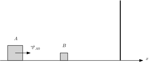 Deux solides A (masse mA et vitesse vA) et B (masse mB≤mA et vitesse vB) peuvent se déplacer sans frottement sur un plan horizontal selon l’axe (Ox). À l’instant initial, B est au repos entre A et le mur, et A se déplace vers B à la vitesse vA0. Les chocs entre masses d’une part, entre une masse et le mur d’autre part, sont élastiques. Les mesures algébriques des vitesses sont vA et vB .