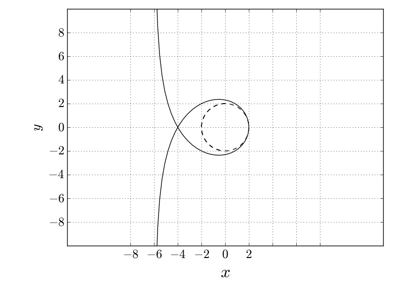 Exemple de trajectoire avec r0=4,0 en unité arbitraire et α=2,0.