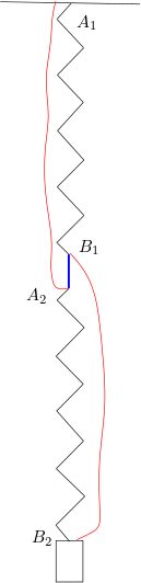 Puis B rentre à nouveau en collision avec A. Après le choc, le problème étant le même que celui du premier choc, B a une vitesse nulle vB,2=0 et vA,2=vB,1′=−vA,0.