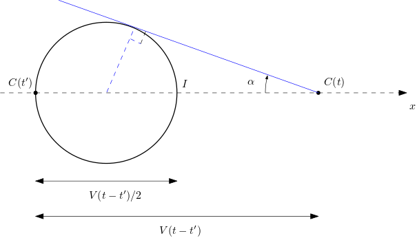 Le cercle est ainsi partagé en deux régions par la droite VB=mAmBVA de vecteur directeur (par exemple) a de coordonnées (mA,mB). Pour qu’il n’y ait pas collision, le point (VA,VB) doit se trouver au-dessus de la droite qui fait un angle arctanmAmB.