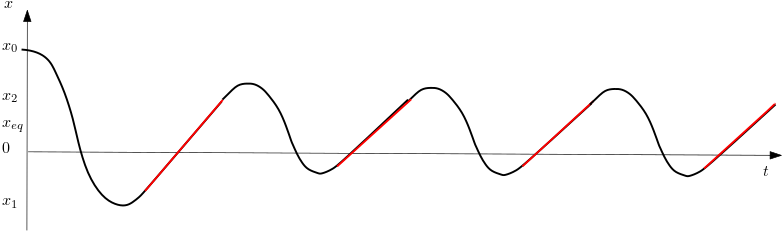 Le mouvement s’arrête pour u=0, soit t=2ω0μcosα1ln(∣∣∣∣∣∣ℓcosαg−ℓsinαv0ℓcosαg+ℓsinαv0∣∣∣∣∣∣).