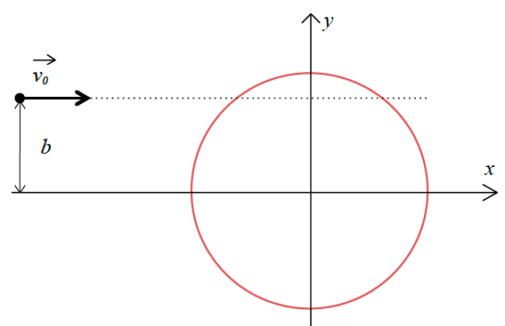 La trajectoire initiale du neutron est rectiligne uniforme de vitesse v0=v0ux et de paramètre d’impact b (voir schéma).