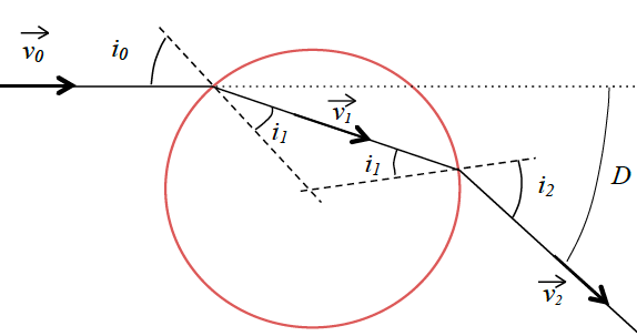 La déviation D=i0−i1+i2−i1=2(i0−i1), soit avec v1=v02+m2U, D=2[arcsin(b/r0)−arcsin(b/(r01+mv022U)]. Remarque — On note bien sûr l’analogie entre les relations donnant les sinus des angles i0,i1,i2 et les lois de Descartes de la réfraction, le rôle de l’indice étant joué par la vitesse.