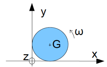 Un cylindre, de masse M, de rayon R, de centre de masse G, est placé sur le sol (contact au point A), tangent à un mur (au point B). Le cylindre tourne initialement à la vitesse angulaire ω0, son centre d’inertie restant fixe.