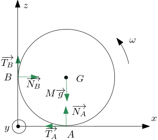 soit (1){−Mg+NA+TB=0TA+NB=0. Remarque ___ Le cylindre reste au contact du mur sans s’en éloigner, ce qui impose le sens de rotation. On le retrouve “avec les équations” en exprimant que le contact avec le mur correspond une réaction normale exercée par le mur dirigée vers le cylindre, soit NB>0, ce qui impose TA<0, et avec les lois de Coulomb impose le sens de rotation du cylindre (la réaction tangentielle est de sens contraire à la vitesse de glissement du cylindre sur le mur).