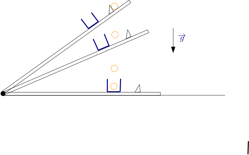Une planche en bois de longueur L peut pivoter sans frottement autour d’un axe horizontal fixe passant par une de ses extrémités. Un gobelet de masse négligeable et une bille de masse m sont posés à l’instant t=0 sur la planche. Le gobelet est solidaire de la planche, la bille se trouve à la distance ℓ de l’axe de rotation.