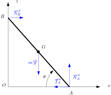 En projetant sur les axes (Ox) et (Oz) : {NA−mg=0NB+TA=0.