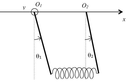 Deux pendules sont constitués de deux tiges homogènes de masses m1 et m2, de même longueur ℓ, dont les points d’attache, fixes, sont sur l’axe (Ox) horizontal et distants de a0. On étudie les mouvements des pendules, en l’absence de frottement, dans le plan vertical (xOz). Les extrémités mobiles des pendules sont reliées par un ressort de longueur à vide a0, de raideur k, de masse négligeable. On donne le moment d’inertie d’une barre homogène par rapport à un axe passant par son extrémité et perpendiculaire à la barre J=m3ℓ2.
