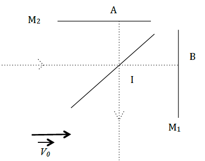 Les deux miroirs et la séparatrice sont fixes dans (R′) et se déplacent donc à la vitesse V0ux dans (R). Dans (R′), le trajet de la lumière IAI est selon (Ix), alors que le trajet de la lumière IBI est selon (Iy). Utilisons la loi classique de composition des vitesses en notant c le vecteur vitesse de la lumière dans (R) : VR′=VR−V0=c−V0ux.