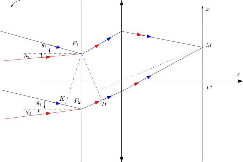 En utilisant le principe de Malus et la loi du retour inverse de la lumière (H2M)=(F1M), et δ=F2H2=asinα≃af′x dans l’approximation de Gauss.