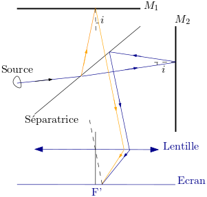 Avec une source étendue, les franges d’interférence (anneaux d’égale inclinaison) sont localisées à l’infini. Pour observer les franges sur un écran, il faut placer l’écran d’observation dans le plan focal image d’une lentille convergente placée à la sortie de l’interféromètre.