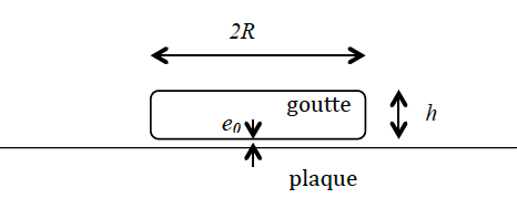 La forme de la goutte résulte de la compétition entre la tension superficielle et la gravité. Nous admettons que la goutte prend la forme d’un palet d’épaisseur h=5,0 mm et de rayon R, très aplati h≪R. L’espace entre la goutte et la plaque est occupé par la vapeur d’eau issue de la goutte.