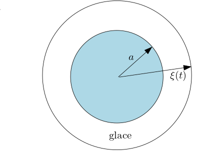 Un grand volume d’eau est à la température θS=0°C. On y plonge un tube cylindrique de glace de rayon a, maintenu à la température θ0=−20°C. Une couche de glace va donc se former autour du tube. On note ξ le rayon extérieur du cylindre de glace formé. Le cylindre est suffisamment long pour qu’on puisse ne pas s’intéresser aux effets de bord.